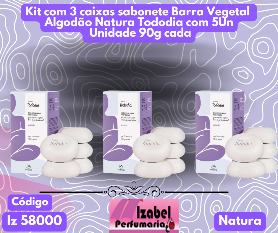 Kit com 3 caixas sabonete Barra Vegetal Algodão Natura Tododia com 5Un Unidade 90g cada